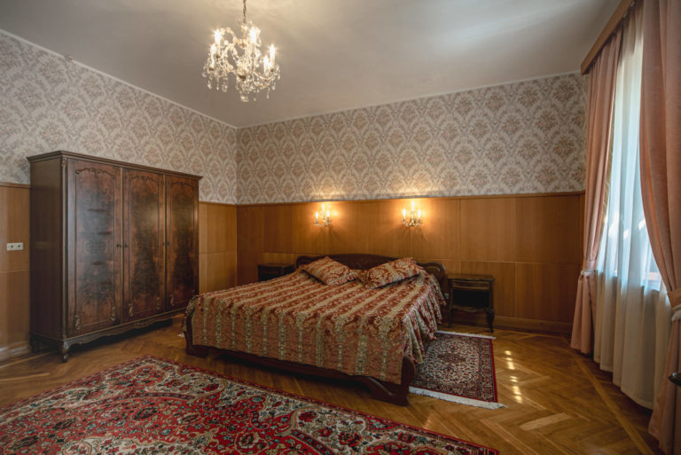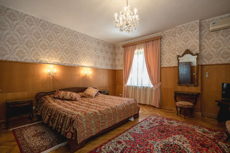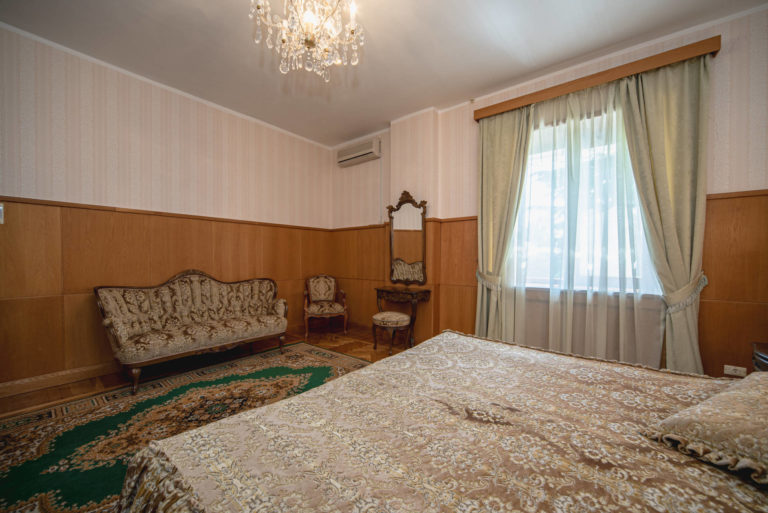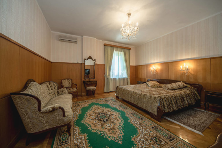 Площадь номера - 124 кв.м. 2 осн. места. 2 доп. места. Мебель: вешалка, диван, зеркало, кресла, кровать двуспальная, прикроватные тумбочки, стол, стулья, шкаф. Оборудование: кондиционер, телевизор, холодильник, чайный набор посуды, электрочайник. Санузел: 2 санузла, с ванной, с душем, тапочки, туалетные принадлежности, фен, халат. Сервис: смена полотенец, смена постельного белья, уборка номера. Терраса.