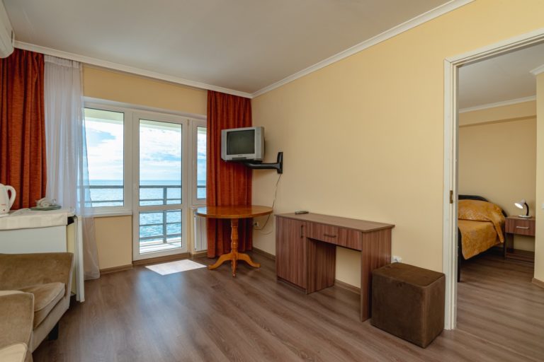 Площадь номера - 25 кв.м. 2 осн. места. 1 доп. место. Мебель: вешалка, зеркало, кровать двуспальная, прикроватные тумбочки, стол, стулья, шкаф. Оборудование: кондиционер, телевизор, холодильник, чайный набор посуды, электрочайник. Санузел: с душем или ванной, туалетные принадлежности, фен. Сервис: смена полотенец, смена постельного белья, уборка номера.