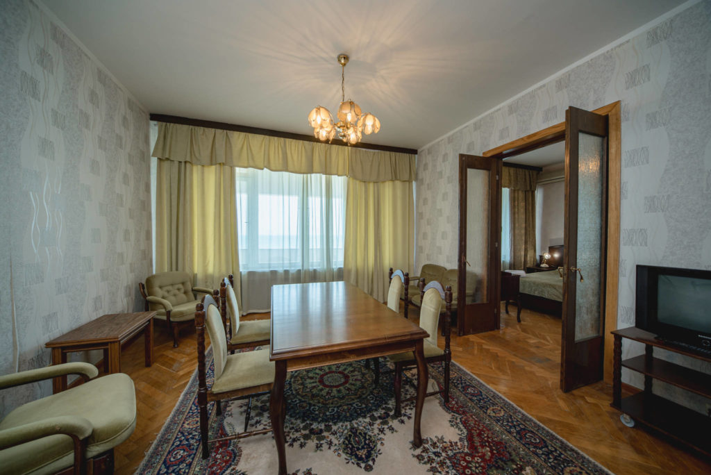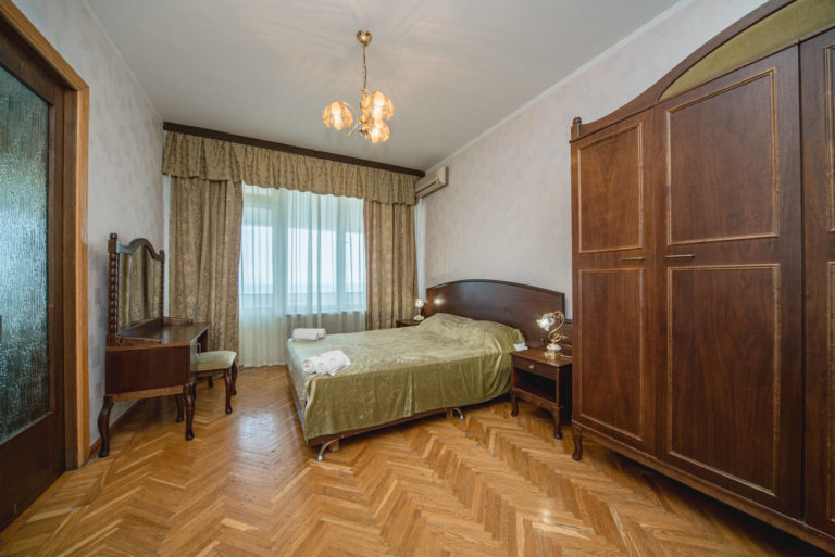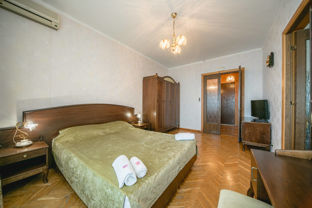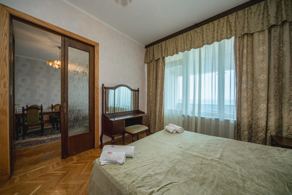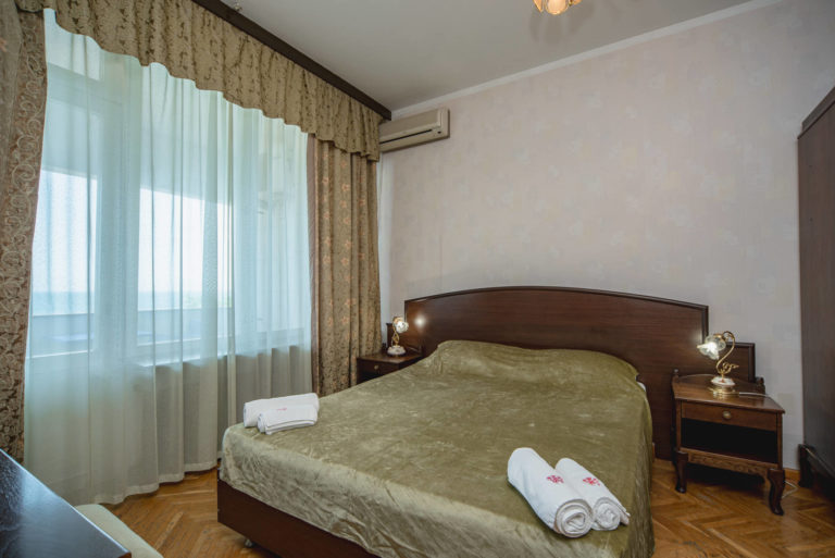Площадь номера - 45 кв.м. 2 осн. места. 2 доп. места. Балкон. Мебель: вешалка, зеркало, кровать двуспальная, прикроватные тумбочки, стол, стулья, шкаф. Оборудование: кондиционер, телевизор, холодильник, чайный набор посуды, электрочайник. Санузел: с душем или ванной, тапочки, туалетные принадлежности, фен, халат. Сервис: смена полотенец, смена постельного белья, уборка номера.