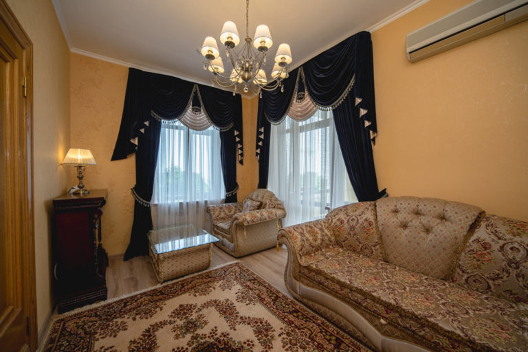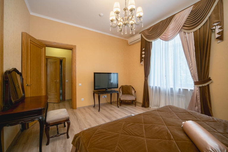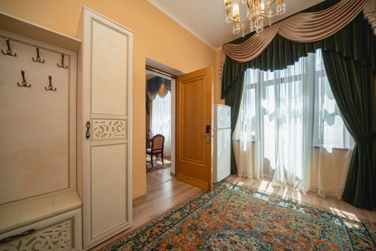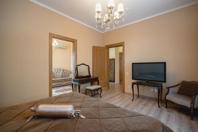 Площадь номера - 68 кв.м. 2 осн. места. 2 доп. места. Балкон. Мебель: вешалка, зеркало, кресла, кровать двуспальная, прикроватные тумбочки, стол, стулья, шкаф. Оборудование: кондиционер, телевизор, холодильник, чайный набор посуды, электрочайник. Санузел: с душем или ванной, тапочки, туалетные принадлежности, фен, халат. Сервис: смена полотенец, смена постельного белья, уборка номера.