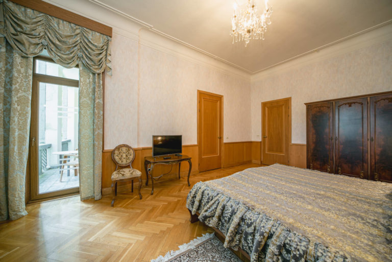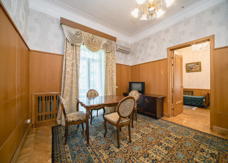 Площадь номера - 70 кв.м. 2 осн. места. 2 доп. места. Балкон. Мебель: вешалка, зеркало, кресла, кровать двуспальная, кровать односпальная, прикроватные тумбочки, стол, стулья, шкаф. Оборудование: кондиционер, телевизор, холодильник, чайный набор посуды, электрочайник. Санузел: с душем или ванной, тапочки, туалетные принадлежности, фен, халат. Сервис: смена полотенец, смена постельного белья, уборка номера.